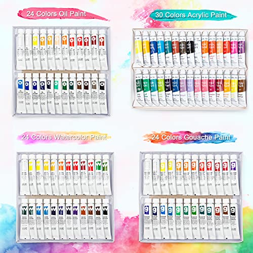 4 TYPES OF PAINT WITH PAINTING MEDIA: This professional painting kit comes wit 30 colors acrylic paint, 24 colors watercolor paint, 24 colors gouache paint and 24 colors oil paint, as well as 4 corresponding paper pads, multi pack canvas panels and stretched canvas, bringing artists unlimited possibilities and interests!