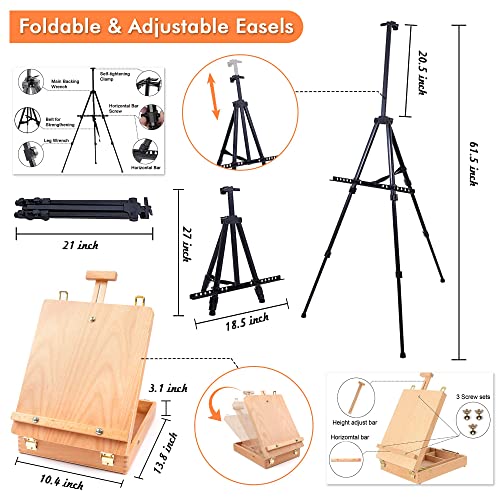 PORTABLE & GIFTABLE EASELS SET: Foldable wooden tabletop easel with box design, you can adjust angles and keep painting accessories inside, suitable for indoor painting. The aluminum easel can be retracted, folded and adjusted in height, which is very suitable for outdoor painting.This painting easel set is an ideal gift choice for families and friends on Christmas, birthday and other holidays.