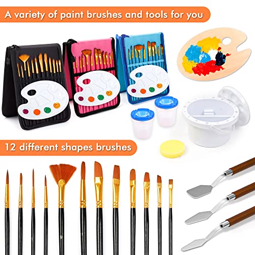 COMPLETE PAINTING SUPPLIES: 3 Sets of professional paint brushes of various shapes and sizes, 3 art painting knifes, 3 multifunctional water buckets, 4 palettes and sponge meet all your demand for creative work. At the same time, you can have exclusive painting accessories for specific paint to achieve the best effect.