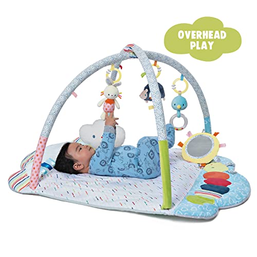 ALL IN ONE 8-PIECE ACTIVITY PLUSH PLAYMAT: Includes premium plush playmat with arches, five multi-sensory toys, fluffy tummy time cloud, baby safe mirror; easy two-minute set up.