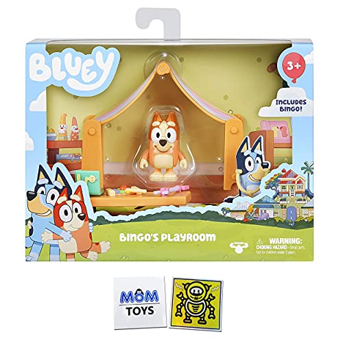 Meet Bluey! A loveable, six-year-old Blue Heeler dog, whose everyday family life becomes a playful adventure. Bring the fun and imaginative play of Bluey and her family home with this cute Bingos Playroom mini playset! With plenty of accessories including a giant Bluey Kiwi Rug and tent where Bingo loves playing doctor or other fun games with Bluey. There is also a bench and other accessories like the xylophone, stethoscope and claw. The Playroom Playset includes one poseable Bingo figure so she can get up to all sorts of adventures! Collect all the other figures and have a playroom playdate! Comes with 2 Exclusive Collectible My Outlet Mall Stickers!