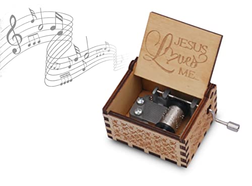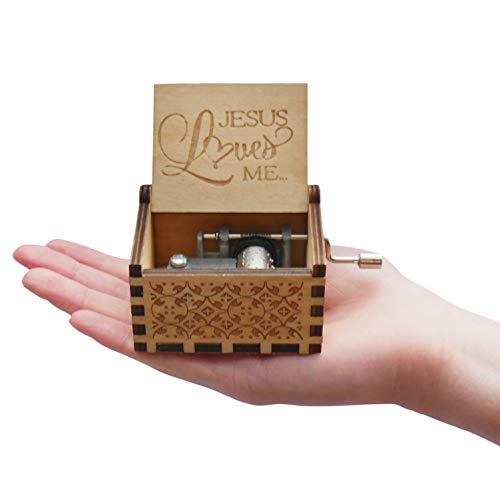 EPIPHANEIA SMALL JESUS LOVES ME WOODEN MUSIC BOX. Beautiful old fashioned, vintage look carved wooden music box / honne box. It requires NO battery or electricity: as you keep cranking the handle it plays the music. Please note that music is only played while the handle is turned. The Jesus Loves Me Music melody of a full verse (not chorus) is projected out of this cute little music box.