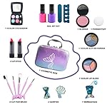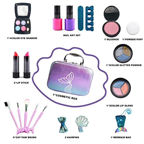 【20PCS Play Make up set】 The girl play set includes: 1*portable cosmetic bag, 2* hairpins, 1* mermaid tail bag, 1* powder, 2* lipsticks, 1* blushes, 5* brushes, 1* eye shadows, 1* lip gloss, 1* glitter, 2* nail polishes, 1* nail file and 1* finger device. Girls can play a variety of different pretend games with our make up kits, role-play party, princess dress up, and everyday fun activities