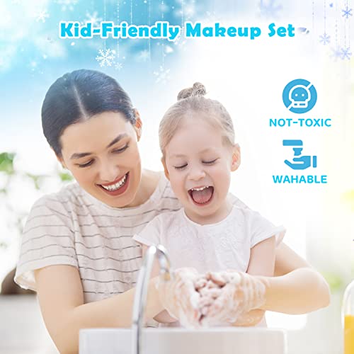 【Washable & Non-Toxic】The toy makeup set is made of material that meets US toy safety standards(CPSIA, CPC, ASTM certificates). We promise to be non-toxic, lead, cadmium, phthalates free and skin-friendly. The child can smell the fruity scent when opening it, and it can be easily washed off with soapy water.