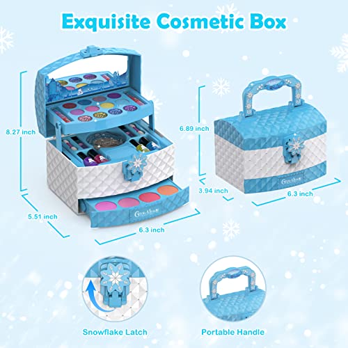 【Frozen Theme Toy for Princess】Every little grils has a girly heart, they always dream of fairy tales, and we should protect the child’s innocence and princess’s dream. The Frozen makeup kit gift uses a unique trapezoidal box and snowflake button design, catering to kids’ love of Frozen.