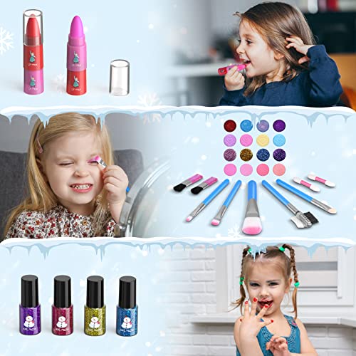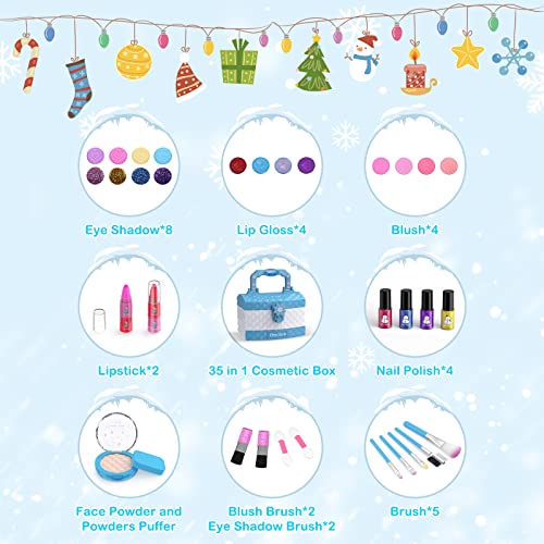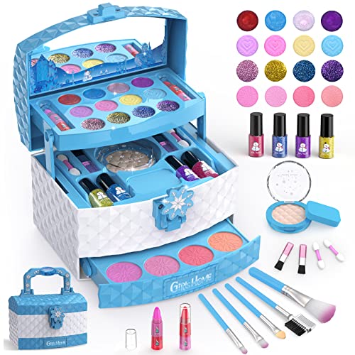 【35 in 1 Girls Makup Kit for Kids】GirlsHome real cosmetic girls toy includes 8 Eye Shadows, 2 Eye Shadow Brushes, 2 Lip Sticks, 4 Lip Glosses, 4 Blushes, 2 Blushes Brushes, 1 Powder, 1 Powder Puff, 4 Nail Polishes, 5 Brushes, 1 Mirror and 1 Case. The little girls makeup kit can meet children’s curiosity about beauty.