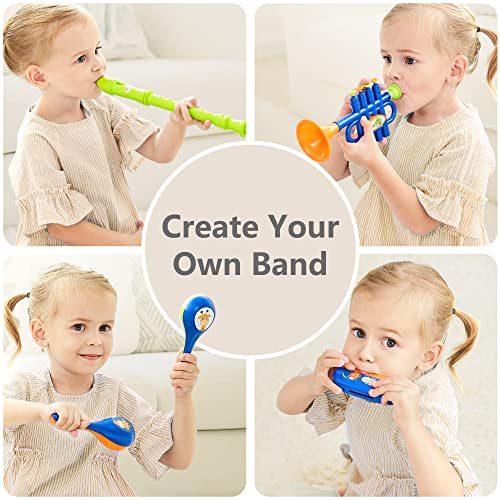 【Musical Instrument】This 6 instrument percussion set comes with Marching Drum, Drum Stickers, Maracas, Tambourines, Trumpet, Flute and Harmonica.