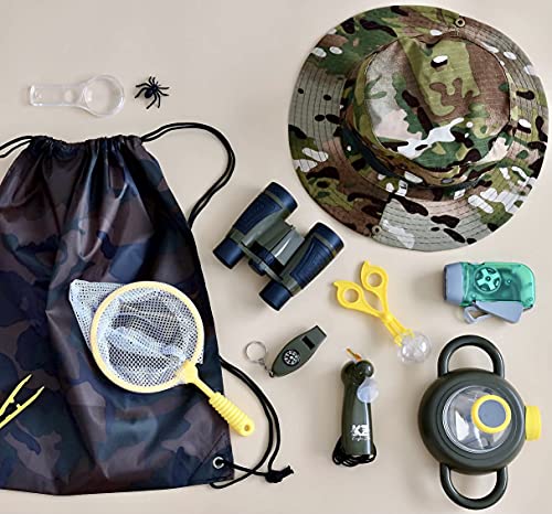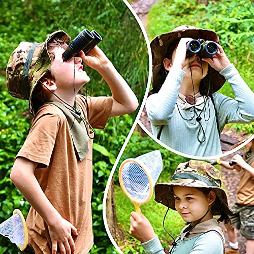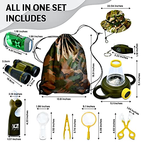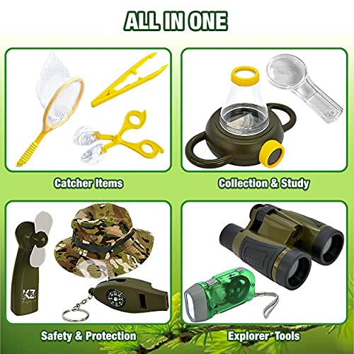 🐞Top Quality Outdoor Explorer & Bug Catcher kit equipped with High-Quality real working Binoculars, Flashlight, Handheld fan, Magnifying glass, Bug Tongs, Innovative Insect viewer, Forceps, Butterfly Net, Backpack, Whistle, compass, and a camo safari Hat