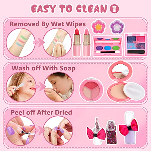 SAFE NON-TOXIC AND WASHABLE KIDS MAKEUP – Your kids’ safety is our number one priority. Our dress up princess play makeup set for kids is made with non-toxic and washable ingredients, it’ll all clean up quickly with soap and water. Kids friendly, 100% safe for your girls.