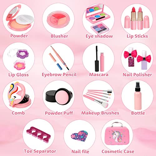 PERFECT GIFT FOR YOUR LITTLE GIRLS – This kids makeup kit for toddler and preschoolers is ideal gifts for a girl age 4 5 6 7 8 9 10 11 12. Your little princess will be thrilled with this complete kids makeup set. It includes everything a daughter or niece could want to have in her first makeup bag. Suitable for every occasion, birthday, pretend play, princess parties, Christmas etc, it will be the focus of all little girls.