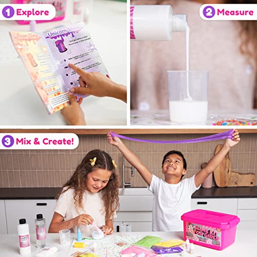 [EVERYTHING IN ONE BOX] 57 Slime Supplies Included – Everything to make unicorn slime stuff: 2 glues x 6.7oz, ~2% borax liquid 5oz, softener 1oz, 7 color pigments, 12 glitters, 4 foam balls bags, instant snow, 2 measuring, 4 storage and 4 mixing containers and 4 tools, plus bright colorful box to organize ingredients store all future slime experiments!