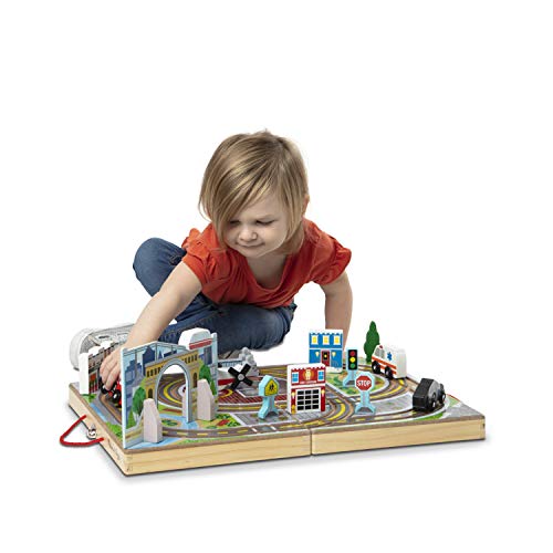 Built-in tracks, colorful scenery, and fun play pieces let kids take their imaginations for a spin . . . and take playtime anywhere they want to go! Unfold the sturdy wooden case to create an illustrated play surface with built-in road tracks for the three wooden wheeled vehicles (a police car, ambulance, and fire engine) and a wooden helicopter to race to the rescue. Set up a bridge and a city tunnel with a monorail that slides across the top! Wooden play pieces include buildings, traffic signs, and a tree to enhance imaginative storytelling. All the pieces store in the fold-up case with convenient carrying handle for easy cleanup and travel (there’s plenty of room to add other toys, too!). Keep playtime rolling for kids three and older and encourage independent play and motor skill development.