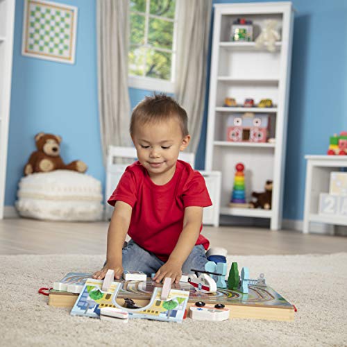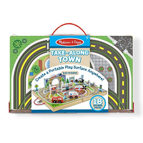 Melissa & Doug 18-Piece Wooden Take-Along Tabletop Town, 4 Rescue Vehicles, Play Pieces, Bridge