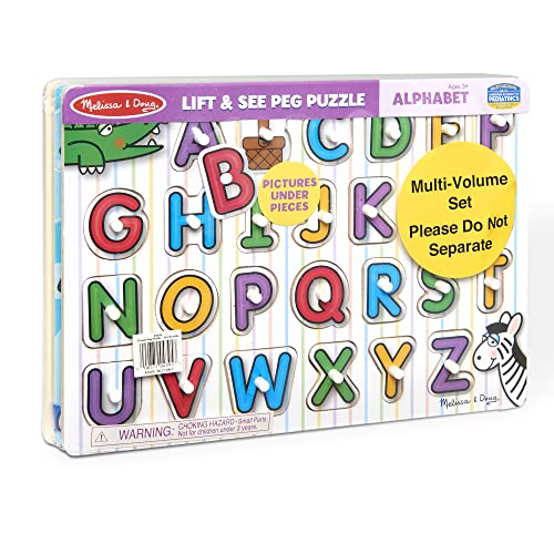 THREE EDUCATIONAL PUZZLES: The Melissa & Doug Classic Wooden Peg Puzzles 3-Pack features appealing, vibrant, and engaging wooden peg puzzles. The set includes (2) See-Inside Alphabet and Numbers puzzles and a Fish Mix & Match Colors puzzle.