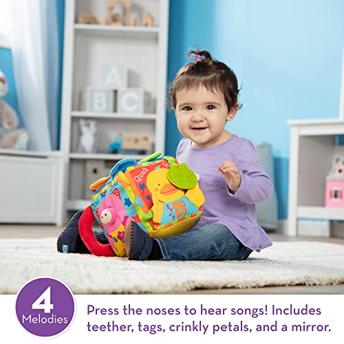 This “farmyard” is full of noisy animals and compact enough to take anywhere! Four animals sound off with their animal songs and play a lively melody when their noses are pressed. Or babies can grasp the padded handle and bump the block against the floor to start the sounds! This feature-filled activity cube also boasts a sturdy textured ring, knotted tags, crinkly flower petals and tabs, and a toddler-tough plastic mirror. Melissa & Doug K’s Kids toys nurture early childhood development in three key skill areas: physical, cognitive, and social. With interactive designs and multisensory features, K’s Kids promotes constructive play and effortless learning, keeping interest high and new skills flourishing throughout the baby and toddler years!