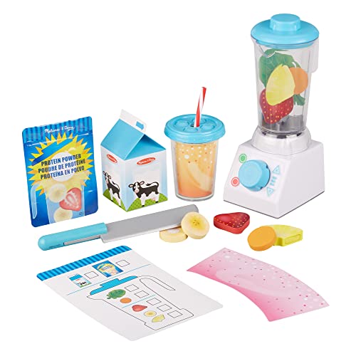 ENTERTAINING PRETEND PLAY BLENDER SET: The Melissa & Doug Smoothie Maker Blender Set is a 22-piece pretend play blender set that includes a base, a jar, and a lid. Several play food ingredients are also included.