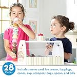 ALL-INCLUSIVE ICE CREAM PLAY SET: The Melissa & Doug Wooden Scoop & Serve Ice Cream Counter includes wooden ice cream counter, eight ice cream scoops, six toppings, two cones, cup, scooper, tongs, wooden spoon, and six pretend dollar 1 bills.