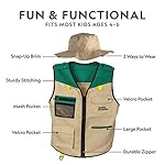 FITS KIDS AGE 6-10 – Our durable safari vest and hat fit a range of girls and boys. Sturdy zippers and stitching stand-up to repeated adventures. Four cargo pockets and yellow carry tabs make it possible to easily pack all the included accessories