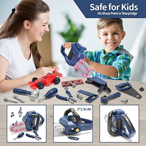 🔩 [ELECTRIC TOY CHAINSAWS TOOLS] – The battery-powered pretend chainsaws tool offers realistic chainsaw noises and lights when the button is pushed. All of these kid tool set is made of ABS plastic, which is very safe for kids with rounded edges and smooth surfaces, and no sharp parts that will hurt children.