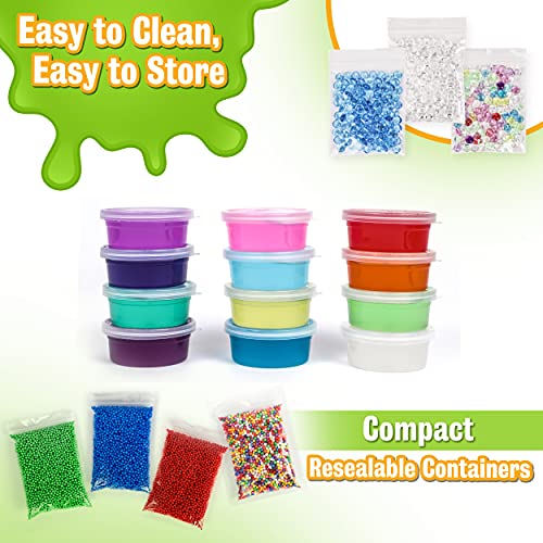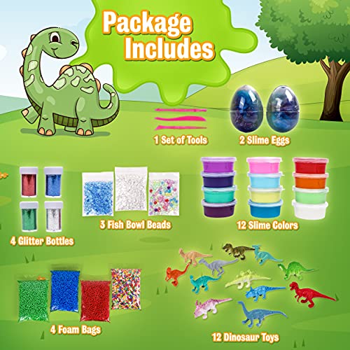 💥 EVERYTHING IN ONE BOX – Our ultimate kids slime kit includes 12 slime colors & containers, 12 dinosaur toys, 4 foam bags, 4 glitter bottles, 3 fish bowl beads, 2 slime eggs and 1 set of tools. Perfect Slime Kit for Boys and Girls. This also makes it the perfect slime making set gift idea.