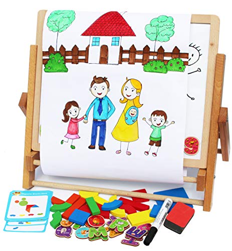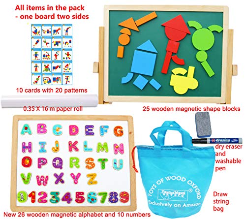 Magnetic art easel for kids- foldable double sided magnetic boards blackboard whiteboard wooden easel, erasable marker and eraser, 25 magnetic wooden shapes and 10 cards with 20 patterns, magnetic alphabet letters and numbers, paper roll and beautiful storage bag