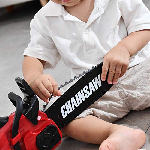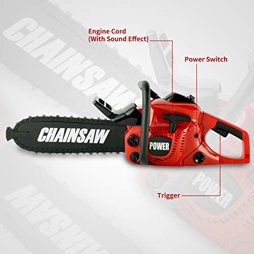 Design: The toy chainsaw is designed according to a real model, not only the appearance alike but also the features such as starter engine sound and pull cord effect sound.