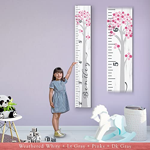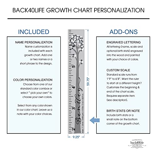 Featuring a painted cherry tree in the background the name and the scale is laid over top, this growth height chart is personalized with your your choice of name or text and ruler scale integrated for recording your child’s height. This beautiful chart also features a script font and classic scale. Birth stats (height, weight, time, date, etc.) or a small note can also be added to the chart as shown in the listing pics. The chart is shipped with a hanger installed and mounting height noted on the back. Just hang on your wall at the height noted, grab your marker, and line the kids up!