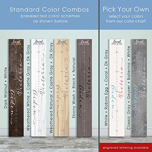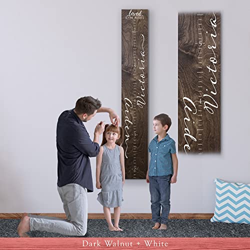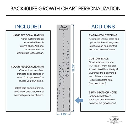 Featuring Loved Beyond Measure with accent arrow at the top, this growth height chart is personalized with your your choice of name or text and ruler scale integrated for recording your child’s height. This beautiful chart also features a script font with a centered modern scale. Birth stats (height, weight, time, date, etc.) or a small note can also be added to the chart as shown in the listing pics. The chart is shipped with a hanger installed and mounting height noted on the back. Just hang on your wall at the height noted, grab your marker, and line the kids up!