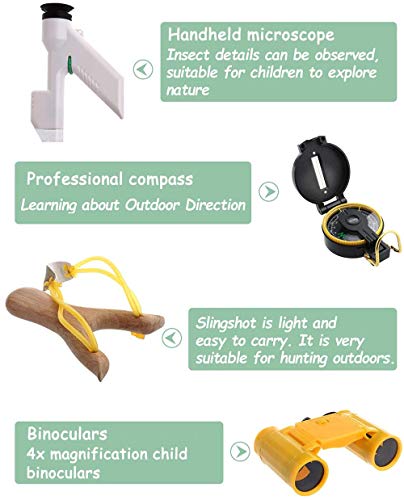 ★[ Complete Outdoor Adventure Kit ] –This Outdoor Adventure Kit for kids includes Binoculars, Handheld microscope, Handle Magnifier,Whistle,Compass,Hand-crank flashlight, Magnifying glass box and magnifying cup,Shovel,Telescopic butterfly net,Wooden slingshot,Tweezers, bug catcher, fake insects,and a Backpack could carry it all. A great educational toys gifts for age 4,5,6,7,8,9,10+ years old boys and girls children.