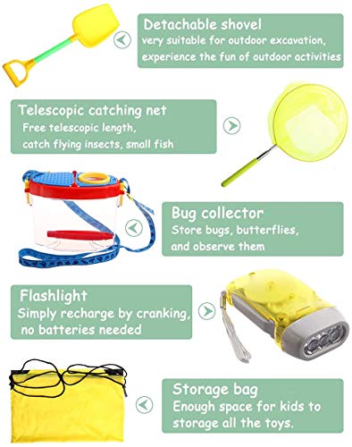 ★[Educational Early Learning Toys Explore the World] – This Adventure package contains everything outdoor play equipment that young explorers needed. High quality binoculars help children detect the surrounding environment. The children will enjoy in use Tekescopic butterfly net to catch live caterpillars,use tweezers or bug catcher kit to catch insects,use handheld microscope to see insect details.A bright hand-crank kids flashlights that easily extends the child’s happiness to the evening.